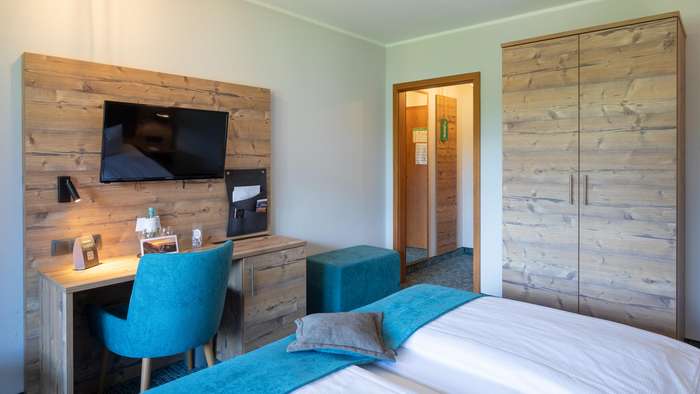 Lassen Sie sich ins große Doppelbett (1,80 x 2,00 m) zurückfallen und starten Sie entspannt in Ihre Auszeit im Chiemgau. Ihr Zimmer ist Ihr persönlicher Rückzugsort, um neue Energie zu tanken.